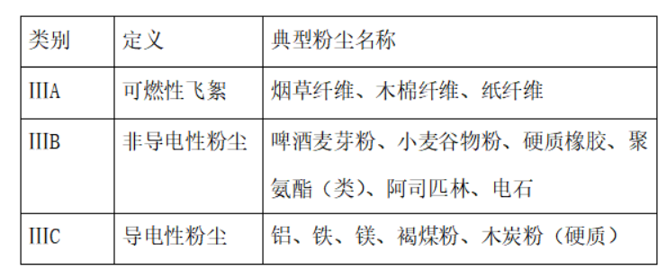 III A、 IIIB和IIIC類:除煤礦瓦斯環(huán)境之外的其他可燃性粉塵,見下表。