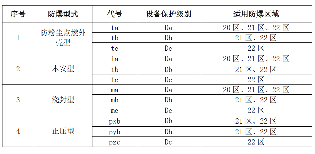 二、防爆保護(hù)型式,即設(shè)備采取的防爆保護(hù)措施,防爆保護(hù)型式以及對應(yīng)的代號關(guān)系見下表。